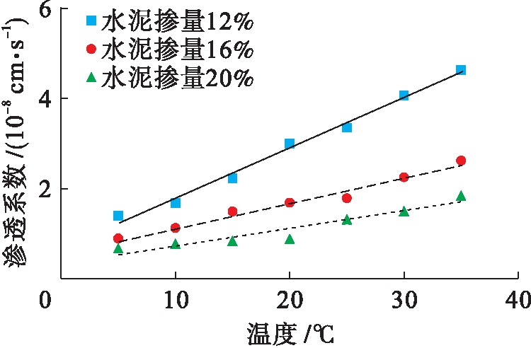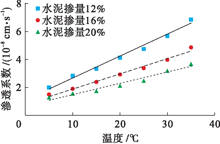 仅考虑围压为0.4 MPa的情况,在清水环境下,水泥土的渗透系数随温度的变化试验曲线如图4所示.试验结果表明,水泥土的渗透系数随温度的升高而逐步增大.对于5、10、15、20、25、30、35 ℃温度下,三种水泥掺量的水泥土渗透系数均呈线性增加,水泥掺量为12%、16%、20%所对应的水泥土渗透系数分别增加了2.35、1.93、1.71倍.渗透系数变化规律表明,同一温度下其水泥掺量越多,水泥土渗透系数越小;随着温度的增加,高水泥掺量的水泥土渗透系数的变化率明显低于低水泥掺量的水泥土渗透系数增加变化率.