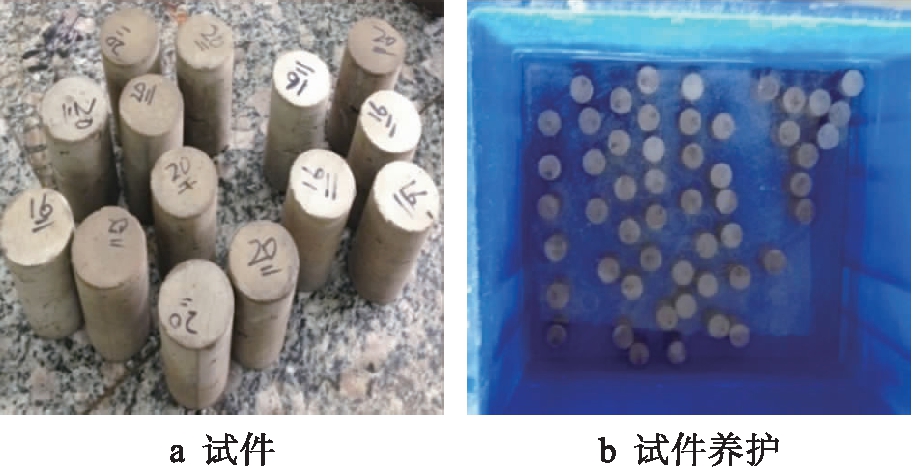 水泥土试件中水泥掺量分别为12%、16%和20%,试验试件尺寸为φ37×72.5 mm,每组3个试件,共42组,制备126个试件.脱模后的试件分别放入海水和清水环境中养护90 d,试件及养护如图1所示.