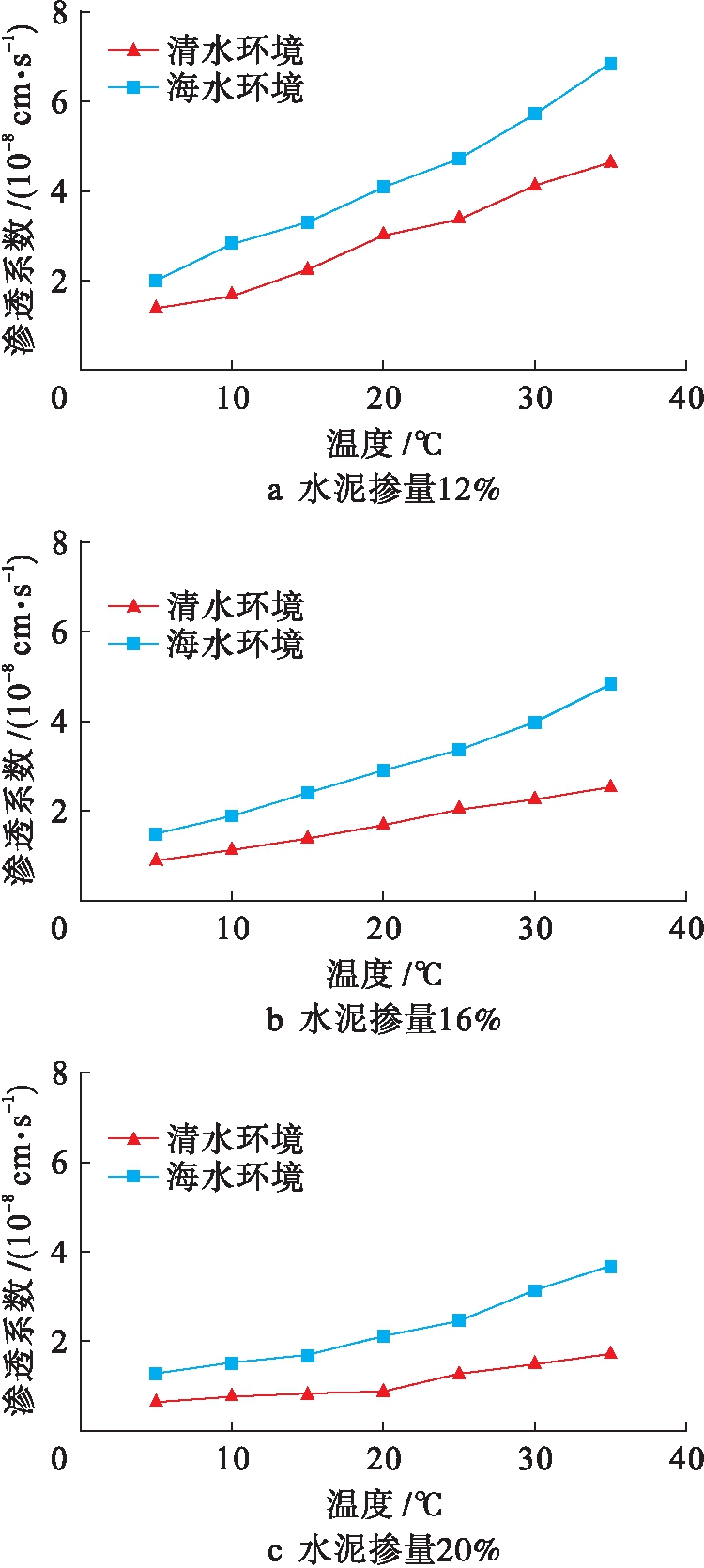 2) 在海水或清水环境下,随着温度的增加其水泥土渗透系数逐步增大,表明温度的变化对水泥土渗透性产生影响;无论哪种水泥掺量,海水环境下的水泥土渗透系数均大于清水环境下的水泥土渗透系数.