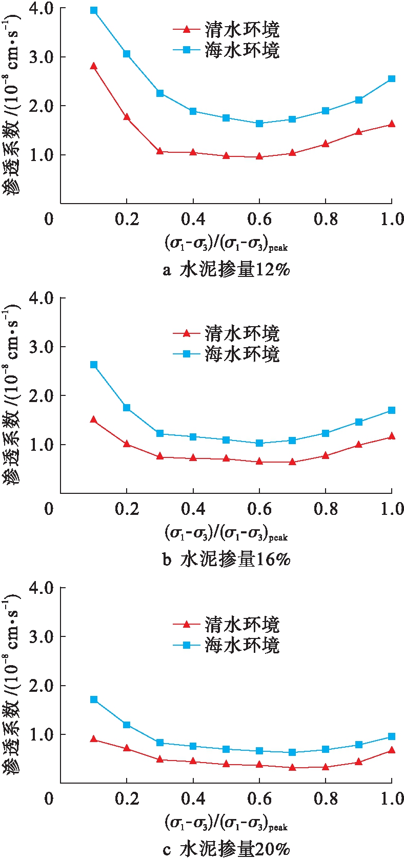 为了对比分析常温下海水和清水对水泥土渗透系数的影响,由于篇幅有限,只讨论围压为0.4 MPa时常温下不同水泥掺量清水环境和海水环境的水泥土渗透系数对比情况,结果如图3所示.无论哪种水泥掺量,在海水环境下,水泥土渗透系数均大于清水环境下的水泥土渗透系数.试验数据以及图中曲线表明,荷载初期,水泥土渗透系数随着轴向应力的增加而逐步降低,当荷载达到某值后(约极限荷载的40%),其水泥土渗透系数随着荷载的增加几乎不再变化,出现平稳状态(约极限荷载的40%~70%之间),当荷载超过约极限荷载的70%时又开始逐步增大,即整个加载过程中水泥土渗透系数呈现出先减小