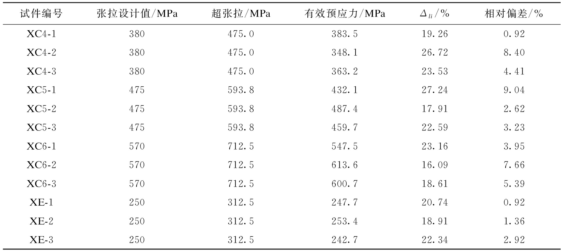 试件编号张拉设计值/MPa超张拉/MPa有效预应力/MPaΔli/%相对偏差/%XC4-1380475.0383.519.260.92XC4-2380475.0348.126.728.40XC4-3380475.0363.223.534.41XC5-1475593.8432.127.249.04XC5-2475593.8487.417.912.62XC5-3475593.8459.722.593.23XC6-1570712.5547.523.163.95XC6-2570712.5613.616.097.66XC6-3570712.5600.718.615.39XE-1250312.5247.720.740.92XE-2250312.5253.418.911.36XE-3250312.5242.722.342.92