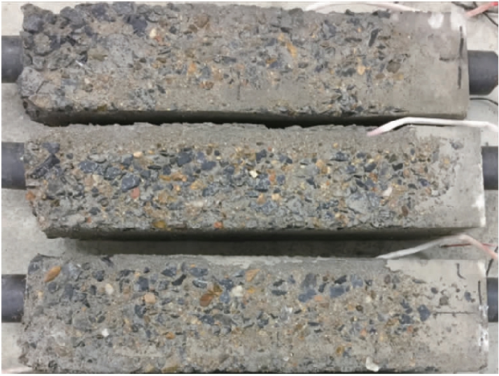 试件发生冻融破坏后,其侧表面情况如图2、3所示.图2为轴心受压试件,从图2中可以看出,三种应力水平的试件表面都发生了硬化水泥砂浆剥落,其中,应力水平为0.5和0.6的试件最为严重,粗骨料大面积外露,并且粗骨料之间的硬化水泥砂浆也不同程度地发生了剥离形成了深浅不一的沟壑,说明预应力的提高加速了混凝土表面的剥落.图3为偏心受压试件,其侧表面剥落情况介于轴心受压应力水平为0.4和0.5的试件之间.无论是偏心受压还是轴心受压试件,破坏时质量损失率均未达到5%,说明质量损失率不是受压混凝土冻融破坏的控制因素.