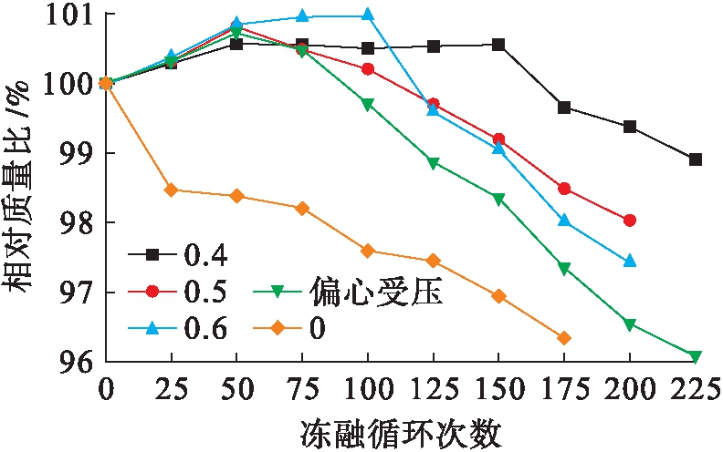 不同受力形式的试件相对质量比(n次冻融循环混凝土质量与初始质量之比)随冻融循环次数的变化曲线如图4所示.从图4中可以看出,这几组试件破坏时质量损失率均未达到5%,无应力试件质量减少得相对较快,这说明一定的压应力可以减缓混凝土表面硬化水泥砂浆的剥落.轴心受压试件质量损失随着应力水平的增加而增加,偏心受压试件的质量变化情况介于无应力试件和轴心受压试件之间.对于有应力试件,在前100个循环时,水分逐渐渗入到混凝土内部,试件质量有所增加.随着混凝土内部孔隙逐渐被水填充,结冰应力开始由内向外释放,外表面出现翘曲并迅速剥落,则出现后期循环相对质量比快速下降.