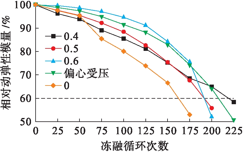 从图5可以看出,随着冻融循环的进行,所有试件的动弹性模量都在下降,无应力试件下降速度最快,破坏的也最早.在轴心受压试件中,随着应力水平的提高,前期冻融循环相对动弹性模量下降就越慢.但是随着冻融循环的进行,应力水平为0.5、0.6的两组试件相对动弹性模量下降速度明显加快,且先于0.4应力水平的试件发生破坏.这说明高应力水平对混凝土早期抗冻性能有一定的帮助,限制了水分的渗入以及微裂缝的产生,但随着冻融循环次数的增加,混凝土的抗压强度会降低[10],相对的压应力水平必然会提高,内部的微裂缝在高压应力和冻胀应力的作用下逐步延伸、扩展,使水分越来越多地渗入到混凝土内部,结冰过程则产生更大的冻胀力,加速了裂缝的贯通,导致混凝土内部损伤严重,动弹性模量快速下降.