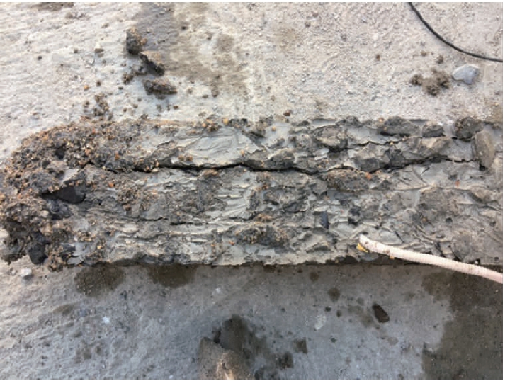 偏心受压试件相对动弹性模量变化介于应力水平为0.5和0.6的试件之间,走势与0.5应力水平的试件相似.由于试件内部压应力上部(浇筑面)大下部小,接近三角形分布,上部的高应力抑制了前期冻融循环时的微裂缝发展,而下部由于浇筑时振捣的原因密实度较高,因此,在混凝土强度明显下降前抗冻性能较好.在150次冻融循环时,试件受压边缘裂纹开始发展,动弹性模量也快速下降,到225个冻融循环时试件上表面已产生两条主裂缝,破坏比较明显,如图6所示.因此,偏心受压混凝土构件要提高受压一侧混凝土的强度和密实度.