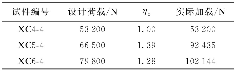 试件编号设计荷载/Nηo实际加载/NXC4-4532001.0053200XC5-4665001.3992435XC6-4798001.28102144