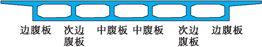 对各道腹板截面名称进行约定,以单箱五室为例(见图4),约定最外两个腹板为边腹板,向截面中心方向依次为次边腹板和中腹板.