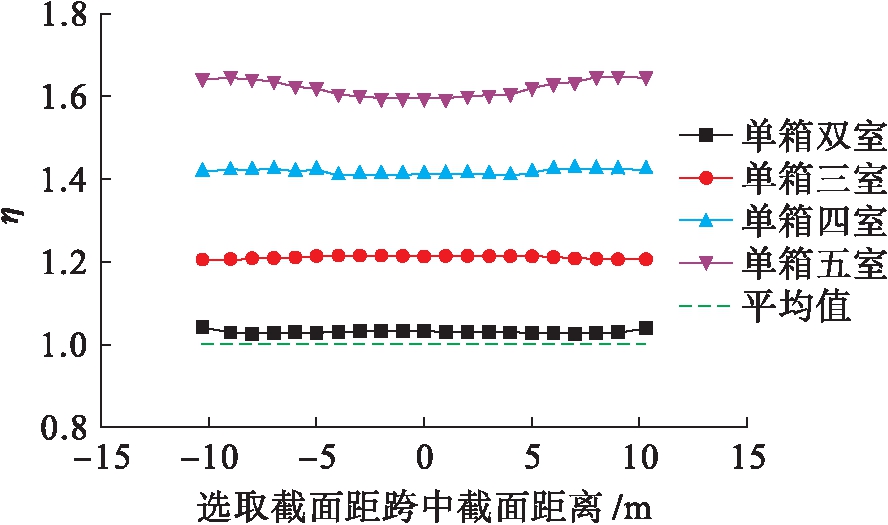 由图7可以看出,在支承条件不变的条件下,随着腹板数量增加,腹板的剪力增大系数η依次增大,以支点截面为例,模型Ⅳ、模型Ⅴ、模型Ⅵ、模型Ⅶ中η分别为1.04、1.21、1.42、1.64.