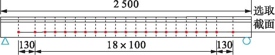 腹板截面为在自重和二期恒载作用下,在纵桥向以跨中为零点,向支座以间距(1.3+18×1.0+1.3) m截取20个截面分析断面,用以考查各道腹板剪力在纵桥向上的分配规律,模型截面选取如图5所示(单位:cm).