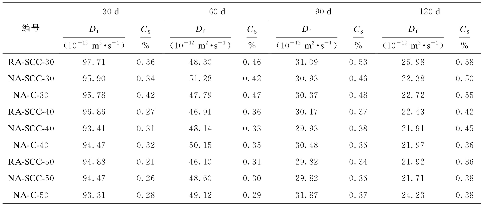 编号30dDf(10-12m2·s-1)CS%60dDf(10-12m2·s-1)CS%90dDf(10-12m2·s-1)CS%120dDf(10-12m2·s-1)CS%RA-SCC-3097.710.3648.300.4631.090.5325.980.58NA-SCC-3095.900.3451.280.4230.930.4622.380.50NA-C-3095.780.4247.790.4730.370.4822.720.55RA-SCC-4096.860.2746.910.3630.170.3722.430.42NA-SCC-4093.410.3148.140.3329.930.3821.910.45NA-C-4094.470.3250.150.3530.480.3621.970.36RA-SCC-5094.880.2146.100.3129.820.3421.920.36NA-SCC-5094.470.2648.600.3029.820.3621.710.38NA-C-5093.310.2849.120.2931.870.3724.230.38