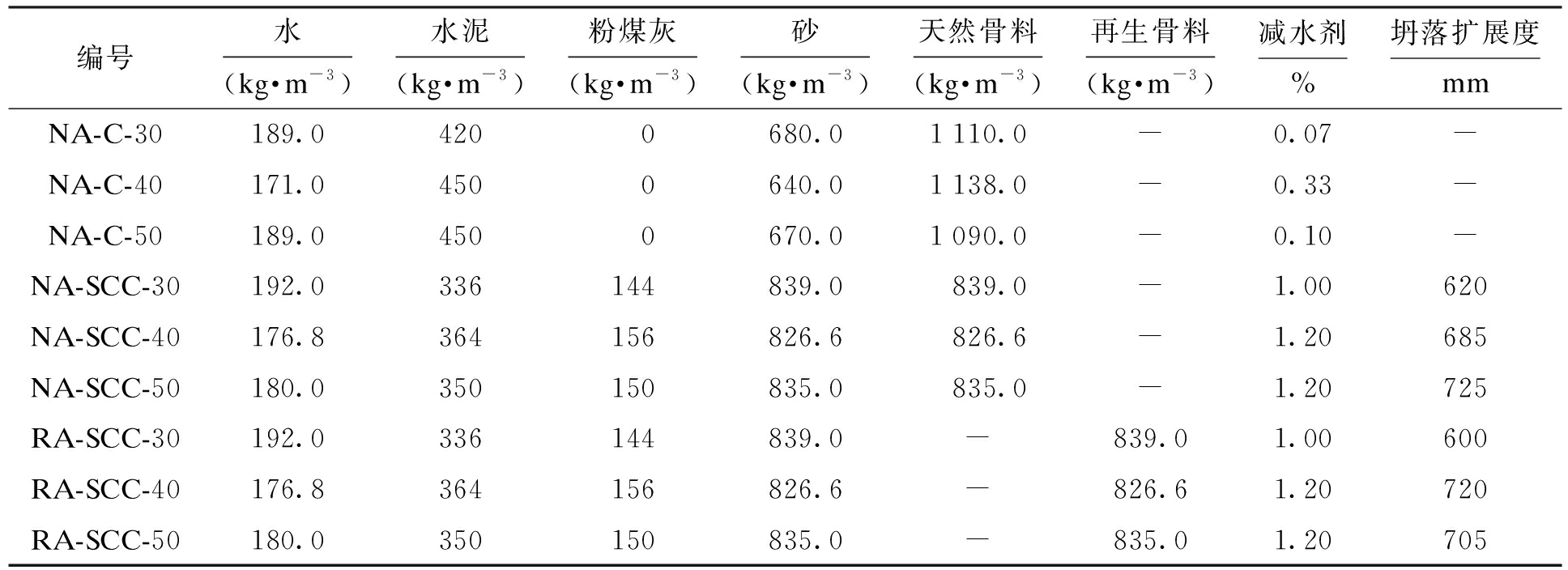 试验采用辽宁本溪生产的山水工源牌水泥,共分两种,其中PS32.5级用于配制C30和C40混凝土,PO42.5级用于配制C50混凝土;粉煤灰为沈西热电厂生产的I级粉煤灰;细骨料为天然水洗中砂,含泥量小于1%;粗骨料分为天然碎石和再生骨料,粒径范围均为5.00~20.00 mm,天然碎石产自辽宁抚顺,其表观密度为2 830 kg/m3,压碎指标和吸水率分别为8.71和0.91,再生骨料由抗压强度等级为C50的实验室废弃混凝土试块经破碎、打磨、筛选而成,其表观密度为2 730 kg/m3,压碎指标和吸水率分别为14.7和5.10;减水剂为辽宁建科院生产的LJ612型高效减水剂.自密实再生混凝土(RA-SCC)与普通混凝土(NA-C)的配合比如表1所示.