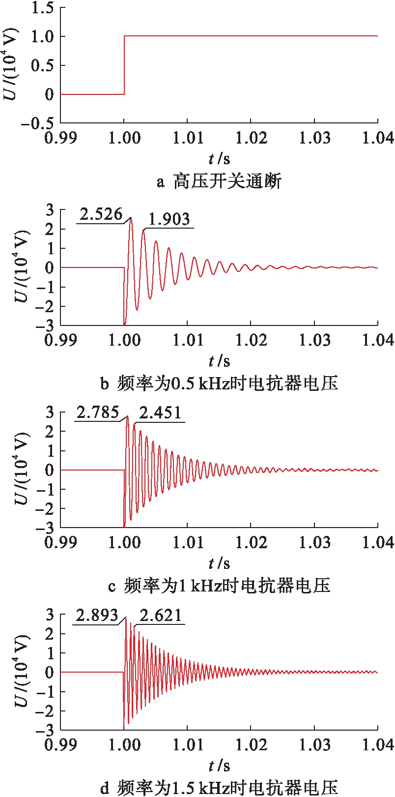 试品的参数确定以后,将不同参数的充电电容输入仿真系统中,对振荡波主电路进行仿真,得到不同频率对应的电抗器电压波形如图3所示.