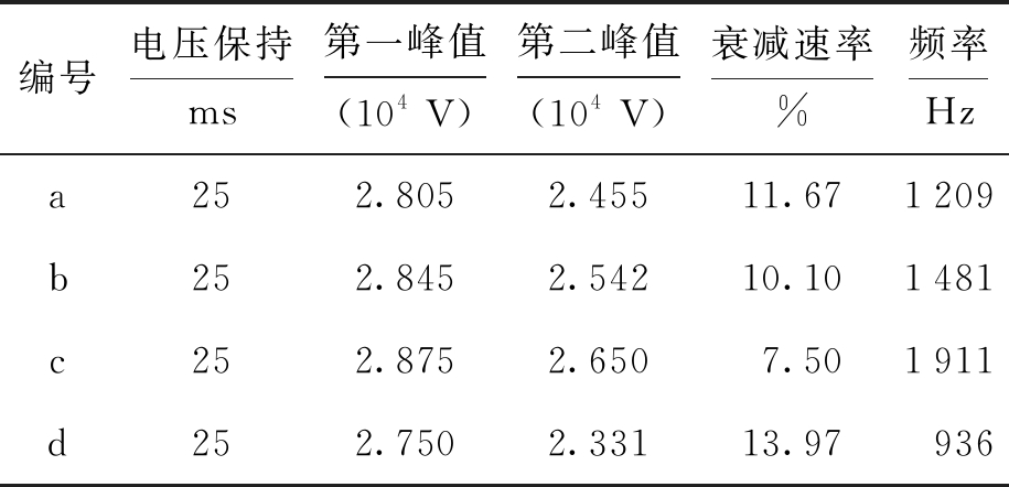由表3可知,a、b、c、d电抗器振荡波的频率在200~2 000 Hz之间,同样振荡波输出电压保持时间为25 ms,第一个峰值在27~29 kV之间,第二个峰值在23~27 kV之间,衰减百分比都在10%左右,衰减速率足够小,以上数据均达到了技术指标的要求.