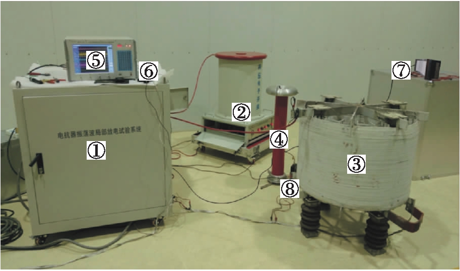 ①高压直流电源 ②高压电子开关 ③试品电抗器 ④局部放电耦合电容器 ⑤局部放电综合检测仪 ⑥局部放电超声波传感器 ⑦局部放电特高频传感器 ⑧局部放电高频传感器
