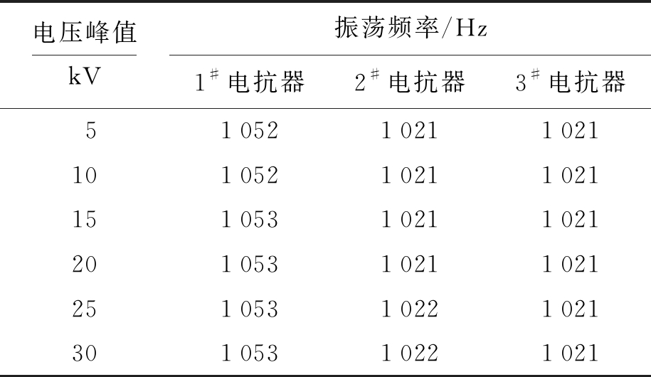 进一步对各电抗器的电压波形进行分析,取5~30 kV不同的振荡电压等级对三个电抗器进行试验,得到不同电抗器两侧的振荡波频率变化如表4所示.