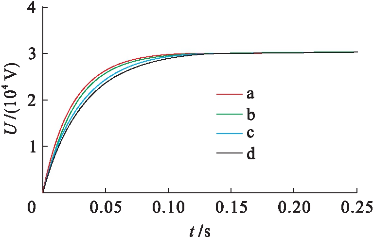 图2中,系统额定电压设置为30 kV,高压直流电源0~50 kV连续可调,保护电阻参数为10 kΩ,高压开关为阶跃信号控制的理想开关,几乎没有延时,其控制信号设置为0时表示高压开关为分开状态;设置为1时表示高压开关为闭合状态.电抗器等效成R和L,R参数为3.025 Ω,L为等效电感,参数为9.628 mH.R2和R3组成分压器,分压比为1 000∶1,R2为分压器高压臂,参数为50 MΩ,R3为分压器低压臂,参数为50 kΩ,系统中只有充电电容为待确定值.