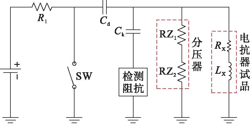 本文设计的振荡波检测系统原理图如图1所示.图1中,试品干式空心电抗器由RX和LX组成,分压器由RZ1和RZ2组成,局放检测单元由Ck耦合电容和检测阻抗组成,振荡波系统由HVDC高压直流电源、Cd充电电容、R1保护电阻及SW高压电子开关组成.试验以干式空心电抗器为试品,电抗器的高压端连接充电电容末端,低压端接地.充电电容首端连接高压电子开关和保护电阻,保护电阻的另一端连接高压直流电源正极,高压直流电源负极接地.试验开始时,高压直流电源对充电电容进行充电,随着高压直流电源输出电压逐渐升高,充电电容两端的电压也随之升高;当充电电容两端电压达到额定电压时,高压直流电源停止工作,同时高压电子开关由分开状态切换到闭合状态;当高压电子开关闭合后,充电电容和电抗器组成阻尼振荡电路,系统主回路的充电电容和电抗器发生串联谐振,形成阻尼振荡波,同时在试品两端产生振荡电压.