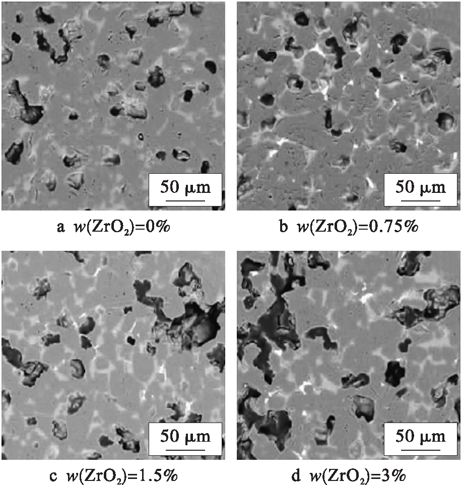 图1 不同ZrO2添加量下Al2O3抗热震陶瓷的SEM图片