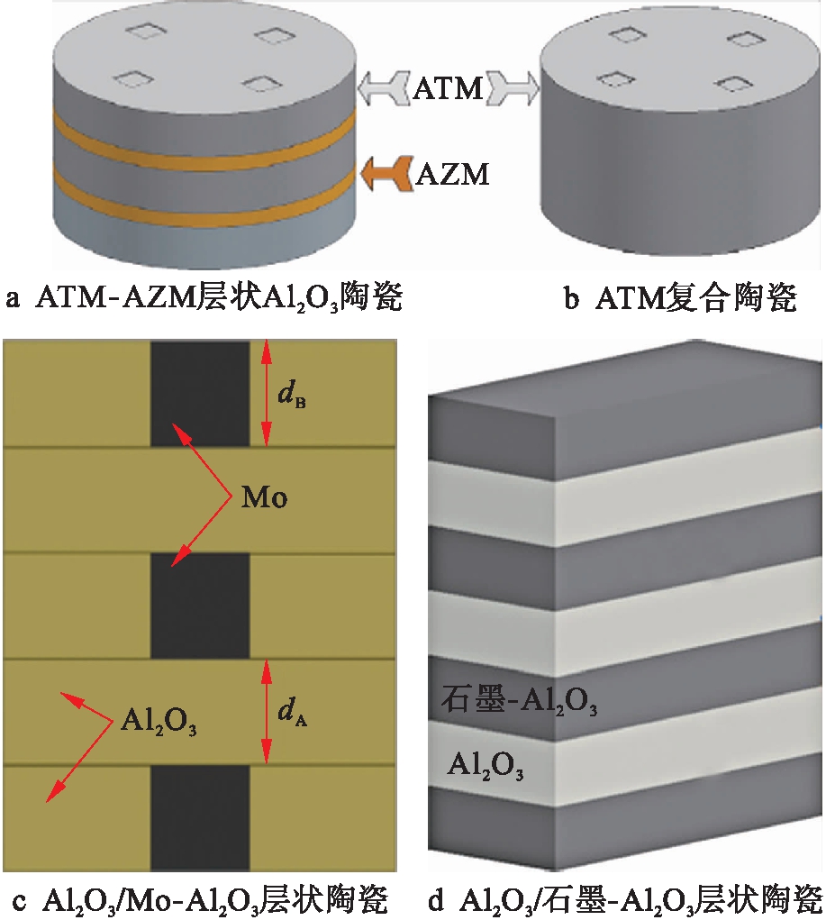 4) 层状Al2O3陶瓷抗热震性能的研究逐渐得到关注.图5为层状Al2O3陶瓷和Al2O3复合陶瓷结构示意图.Liu等[130]利用Al2O3-TiN-MgO(ATM)和Al2O3-ZrB2-MgO(AZM)制备出层状Al2O3陶瓷(见图5a),其中ATM可视为基体,并与传统Al2O3-TiN-MgO复合陶瓷(见图5b)进行了抗热震性能对比.这种层状Al2O3复合陶瓷比传统ATM复合陶瓷具有更高的断裂韧性和热震后残余强度,传统ATM复合陶瓷的临界热震温差为423 ℃,而层状Al2O3陶瓷可将临界热震温差提高至527 ℃.Chen等[131]研究发现Al2O3/Ni/Al2O3/Ni层状陶瓷比单相Al2O3陶瓷表现出更佳的抗热震性能,在150~1 200 ℃热震温差范围内,含有Ni的层状Al2O3陶瓷经热震后的残余抗弯强度在各个热震温差下均大于单相Al2O3陶瓷,且差值约150 MPa以上.单相Al2O3陶瓷的临界热震温差为250 ℃,而含有Ni的层状Al2O3陶瓷的临界温差为350 ℃.层状陶瓷热裂纹萌生和扩展的阻力增加是由于Al2O3层中存在残余压应力,且Ni层的延展性能能够钝化裂纹.Song等[132]设计制备出Al2O3/Mo-Al2O3层状陶瓷(见图5c),该层状Al2O3陶瓷经1 000 ℃温差(水冷)热震循环50次后,断裂韧性和抗弯强度保持率分别可达98.8%和85.3%.Song等[133]还开发出Al2O3/石墨-Al2O3层状陶瓷(见图5d),这种层状结构陶瓷不仅能够阻碍氧的迁移并减少石墨氧化,而且为石墨氧化后的良好力学性能提供了结构框架.与传统Al2O3-石墨复合陶瓷相比,该层状陶瓷表现出更好的抗热震性,经800 ℃热震温差(水冷)循环50次后,复合陶瓷的断裂韧性和抗弯强度保持率分别可达90%和74%.上述各种层状复合陶瓷为提高Al2O3陶瓷的抗热震性提供了一种新途径.因此,开发抗热震性能优良的高温工程用叠层Al2O3陶瓷复合材料将成为今后的一个研究方向.