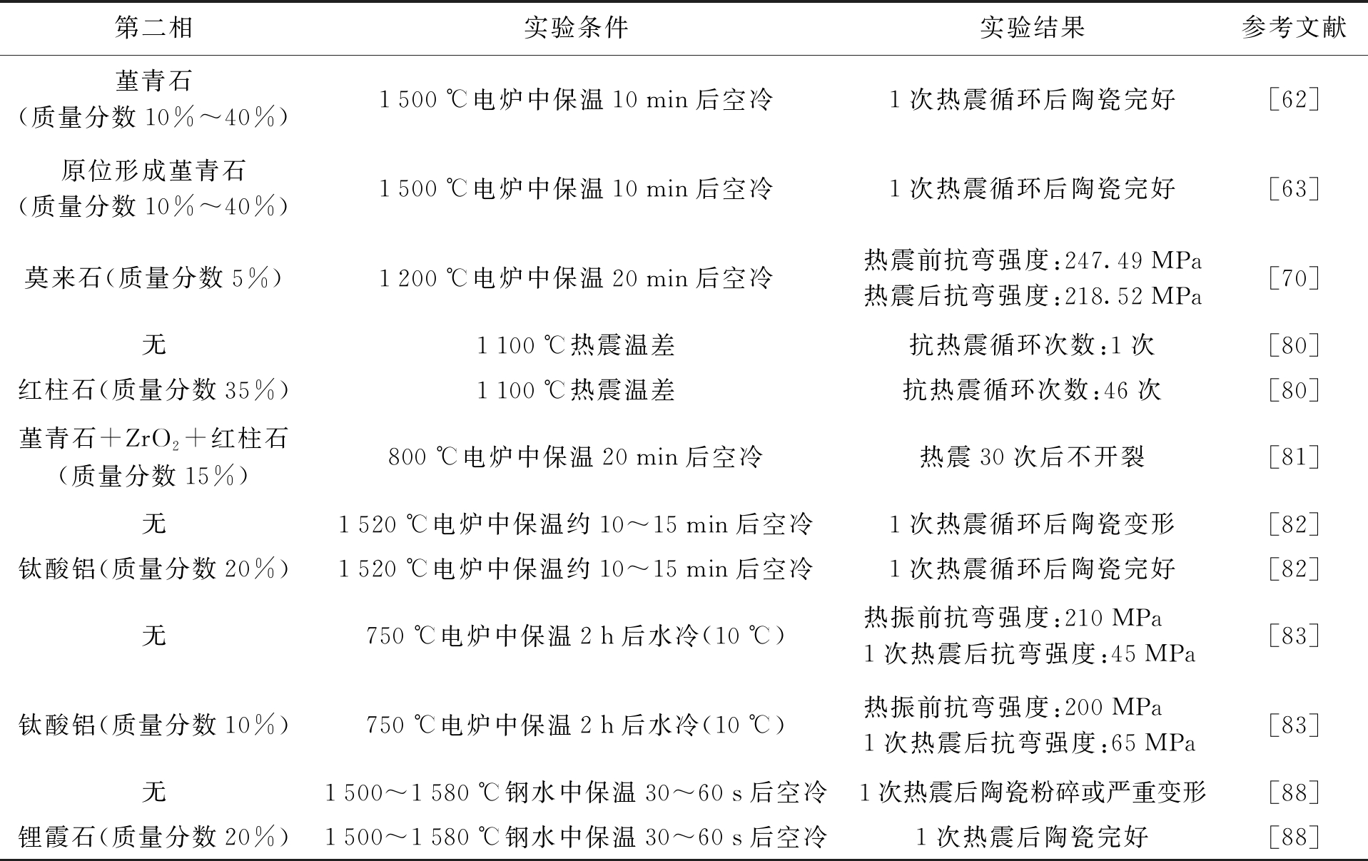 第二相实验条件实验结果参考文献堇青石(质量分数10%~40%)1500℃电炉中保温10min后空冷1次热震循环后陶瓷完好[62]原位形成堇青石(质量分数10%~40%)1500℃电炉中保温10min后空冷1次热震循环后陶瓷完好[63]莫来石(质量分数5%)1200℃电炉中保温20min后空冷热震前抗弯强度:247.49MPa热震后抗弯强度:218.52MPa[70]无1100℃热震温差抗热震循环次数:1次[80]红柱石(质量分数35%)1100℃热震温差抗热震循环次数:46次[80]堇青石+ZrO2+红柱石(质量分数15%)800℃电炉中保温20min后空冷热震30次后不开裂[81]无1520℃电炉中保温约10~15min后空冷1次热震循环后陶瓷变形[82]钛酸铝(质量分数20%)1520℃电炉中保温约10~15min后空冷1次热震循环后陶瓷完好[82]无750℃电炉中保温2h后水冷(10℃)热振前抗弯强度:210MPa1次热震后抗弯强度:45MPa[83]钛酸铝(质量分数10%)750℃电炉中保温2h后水冷(10℃)热振前抗弯强度:200MPa1次热震后抗弯强度:65MPa[83]无1500~1580℃钢水中保温30~60s后空冷1次热震后陶瓷粉碎或严重变形[88]锂霞石(质量分数20%)1500~1580℃钢水中保温30~60s后空冷1次热震后陶瓷完好[88]
