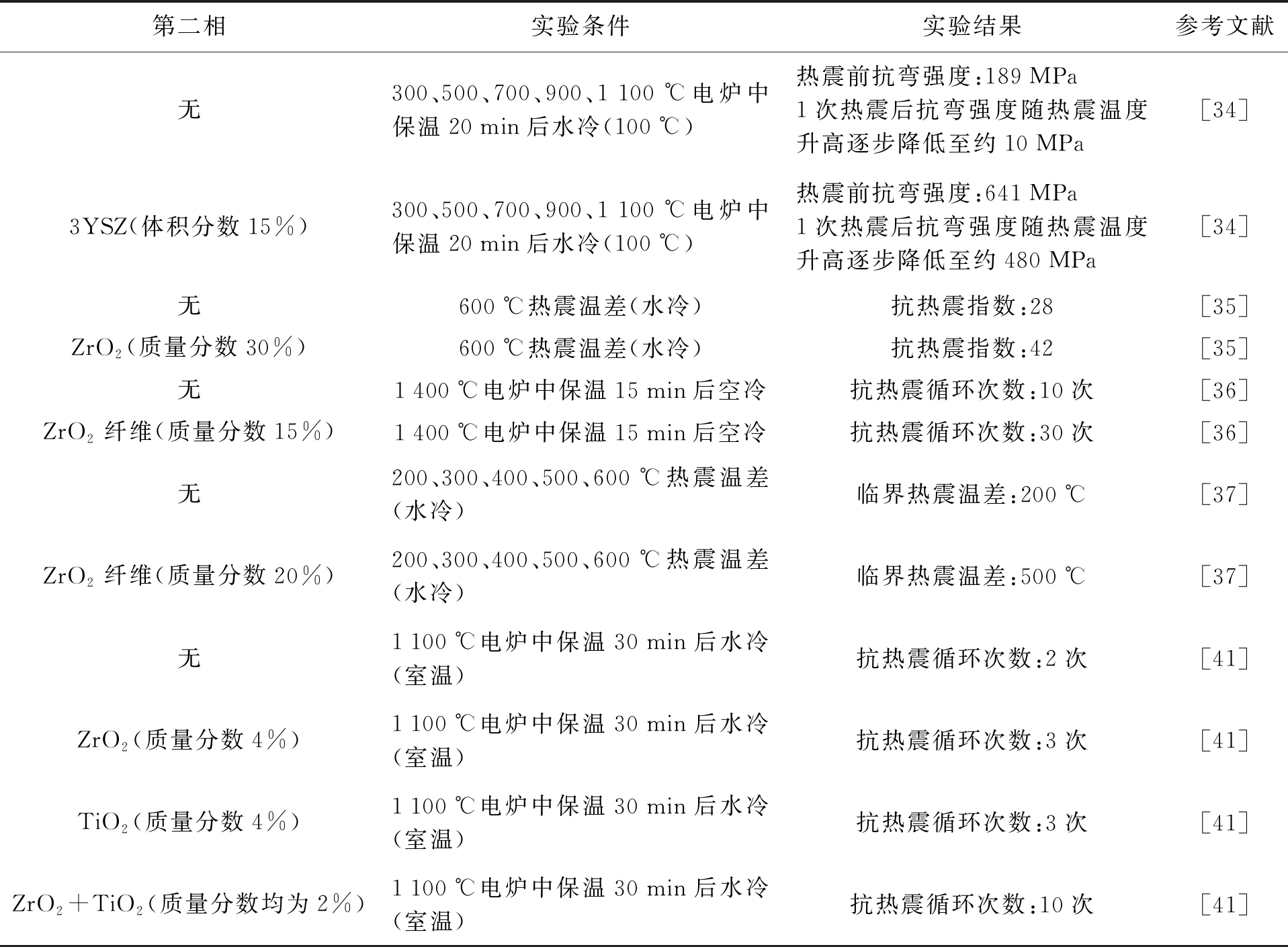 第二相实验条件实验结果参考文献无300、500、700、900、1100℃电炉中保温20min后水冷(100℃)热震前抗弯强度:189MPa1次热震后抗弯强度随热震温度升高逐步降低至约10MPa[34]3YSZ(体积分数15%)300、500、700、900、1100℃电炉中保温20min后水冷(100℃)热震前抗弯强度:641MPa1次热震后抗弯强度随热震温度升高逐步降低至约480MPa[34]无600℃热震温差(水冷)抗热震指数:28[35]ZrO2(质量分数30%)600℃热震温差(水冷)抗热震指数:42[35]无1400℃电炉中保温15min后空冷抗热震循环次数:10次[36]ZrO2纤维(质量分数15%)1400℃电炉中保温15min后空冷抗热震循环次数:30次[36]无200、300、400、500、600℃热震温差(水冷)临界热震温差:200℃[37]ZrO2纤维(质量分数20%)200、300、400、500、600℃热震温差(水冷)临界热震温差:500℃[37]无1100℃电炉中保温30min后水冷(室温)抗热震循环次数:2次[41]ZrO2(质量分数4%)1100℃电炉中保温30min后水冷(室温)抗热震循环次数:3次[41]TiO2(质量分数4%)1100℃电炉中保温30min后水冷(室温)抗热震循环次数:3次[41]ZrO2+TiO2(质量分数均为2%)1100℃电炉中保温30min后水冷(室温)抗热震循环次数:10次[41]