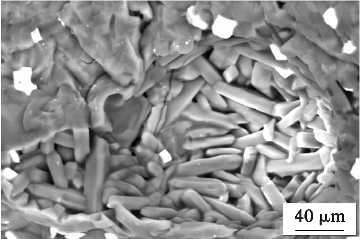 堇青石是一种具有较低热膨胀系数的矿物材料,堇青石可采用天然矿物高温固相反应法、高纯氧化物高温固相反应合成法、工业或农业废料合成法和溶胶凝胶法和低温燃烧合成法等制备[55],被广泛应用于结构陶瓷、耐火材料、多孔材料、介电材料、红外材料和电子封装材料等领域[56-60].将堇青石添加到Al2O3陶瓷中,可以降低材料的热膨胀系数,从而提高Al2O3陶瓷的抗热震性能.张巍、韩亚苓等[61-62]首先以高纯氧化物高温固相反应合成法制备出堇青石,再将制得的堇青石添加到Al2O3陶瓷中,研究了堇青石添加量对Al2O3陶瓷抗热震性能的影响.当堇青石的质量分数为10%时,Al2O3陶瓷能够承受1 500 ℃热震温差(空冷)的破坏.Al2O3陶瓷抗热震性能的提高可以归因于陶瓷内部形成的大量长柱状晶粒[62].图2为含有质量分数为10%的堇青石的Al2O3抗热震陶瓷的SEM图片[62].由图2可见,长柱状晶粒纵横交错,任意一个长柱状晶粒都与周围多个不同走向的长柱状晶粒相连结,彼此相互制约和加强.互相连结的长柱状晶粒能够较好地抵抗由于热震引起的裂纹扩展,提高了裂纹扩展所需能量,因而提高了抗热震性能.为了简化Al2O3-堇青石陶瓷的制备工艺并降低成本,韩亚苓等[63]在Al2O3陶瓷中直接添加MgO和SiO2利用原位法形成堇青石,制备出Al2O3-堇青石陶瓷,结果表明原位法制备的Al2O3-堇青石陶瓷同样具备良好的抗热震性能,这为工业化生产Al2O3抗热震陶瓷奠定了理论基础.袁红涛等[64]研究发现,Al2O3-堇青石陶瓷在1 230~1 280 ℃烧成温度范围内,热导率随烧成温度的升高而增大,这与陶瓷致密度随烧成温度的升高而增大有关.气体热容比Al2O3晶体热容低,且会使声子发生散射,因而随着烧成温度的升高,气孔减少,热导率提高.Al2O3-堇青石陶瓷经过10次800 ℃热震温差(水冷)和40次600 ℃热震温差(水冷)测试后,陶瓷尚未开裂.