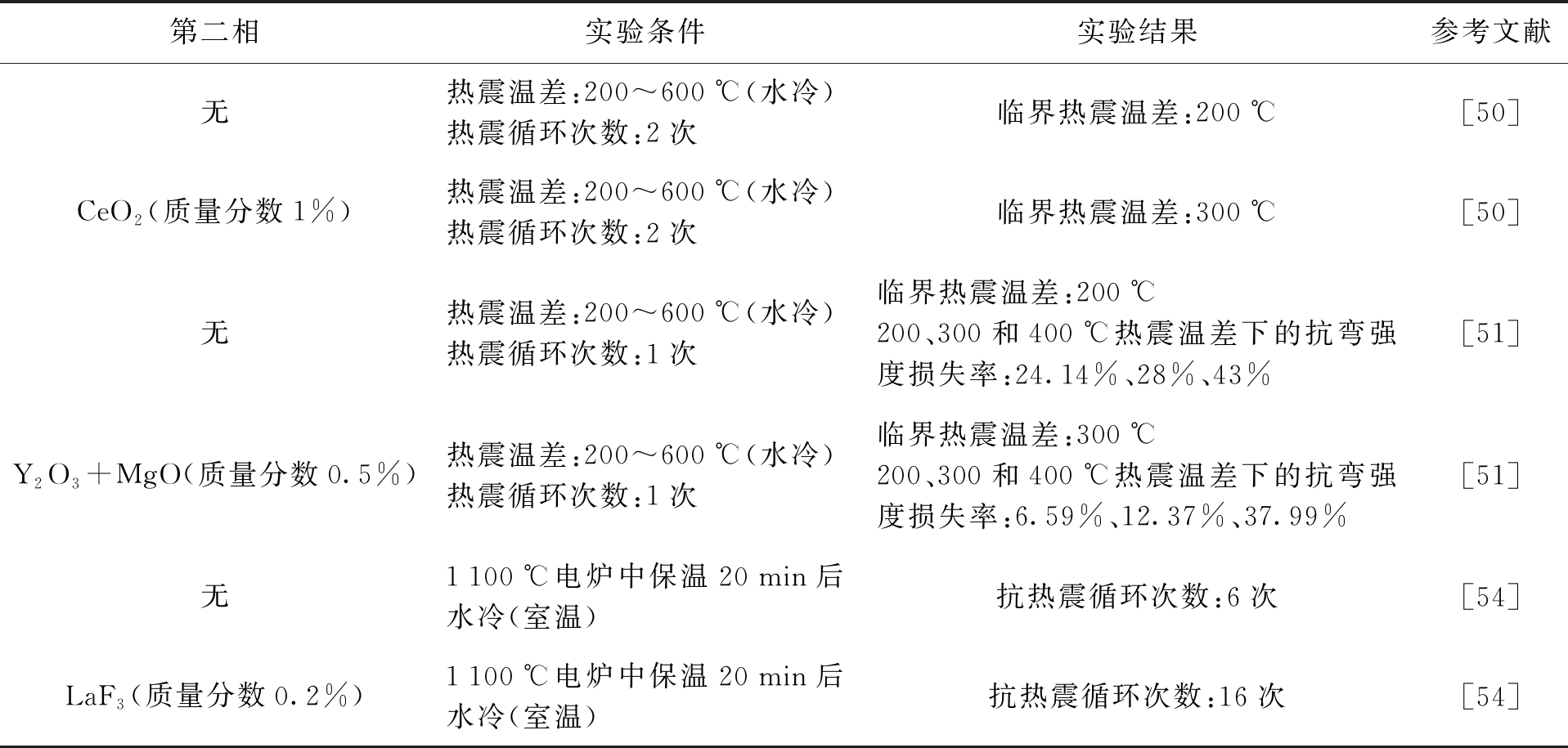 第二相实验条件实验结果参考文献无热震温差:200~600℃(水冷)热震循环次数:2次临界热震温差:200℃[50]CeO2(质量分数1%)热震温差:200~600℃(水冷)热震循环次数:2次临界热震温差:300℃[50]无热震温差:200~600℃(水冷)热震循环次数:1次临界热震温差:200℃200、300和400℃热震温差下的抗弯强度损失率:24.14%、28%、43%[51]Y2O3+MgO(质量分数0.5%)热震温差:200~600℃(水冷)热震循环次数:1次临界热震温差:300℃200、300和400℃热震温差下的抗弯强度损失率:6.59%、12.37%、37.99%[51]无1100℃电炉中保温20min后水冷(室温)抗热震循环次数:6次[54]LaF3(质量分数0.2%)1100℃电炉中保温20min后水冷(室温)抗热震循环次数:16次[54]