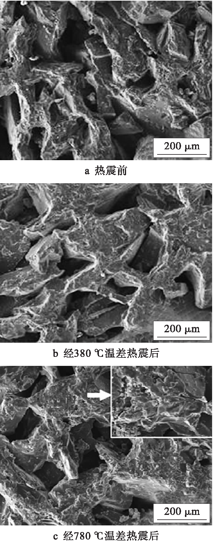多孔Al2O3陶瓷常被用于高温除尘装置中的过滤元件,当高温烟气通过管壁向陶瓷管内部扩散时,粉尘被留在过滤管外表面[120].随着粉尘厚度的增加,需向过滤管内部充入温度较低的高压气体将管外粉尘清除.由于多孔Al2O3陶瓷管内、外温差较大,陶瓷内部会产生热应力,当应力超过陶瓷的拉伸极限时就会断裂,因而应用于高温除尘装置中过滤元件的多孔Al2O3陶瓷需要具有良好的抗热震性能.周爱萍等[121]以刚玉粉为骨料、活性炭为造孔剂,采用等静压成型工艺制备出气孔率为31%、抗弯强度为36.55 MPa的Al2O3多孔陶瓷过滤管,并研究了该多孔陶瓷过滤管经380、580、780和980 ℃热震温差(水冷)后的抗热震性能,结果表明Al2O3多孔陶瓷过滤管热震后的残余强度随着热震温差的升高而降低,且临界热震温差为461 ℃.对比该Al2O3多孔陶瓷过滤管热震前和经380和780 ℃温差热震后的SEM图片[121](见图4)可知,多孔Al2O3陶瓷中气孔呈不规则形状,分布比较均匀,并以三维网状结构遍布整个陶瓷,Al2O3陶瓷孔道周围光滑.该Al2O3多孔陶瓷经380 ℃热震温差后,陶瓷表面形貌与未经热震的陶瓷相比无明显差异.而经780 ℃热震温差后,Al2O3多孔陶瓷出现微小裂纹,这是由于在较高热震温差下材料表面因拉应力的存在而产生微裂纹,但这些微裂纹并未进行蔓延,所以未发生断裂.在外力作用下上述微裂纹会发生扩展,因而导致陶瓷热震后的残余强度下降.张桂花等[122]制备出孔隙率为35.7%、平均孔径为120 nm、热膨胀系数为7.03×10-6℃-1的Al2O3多孔陶瓷,并研究了其经100、200、300、400和500 ℃热震温差(水冷)后Al2O3多孔陶瓷的抗热震性能.该Al2O3多孔陶瓷的残余强度随着热震温差的增加而降低,并且当热震温差为200 ℃时强度明显降低.当Al2O3多孔陶瓷处于急冷条件时,其表面温度低于内部,表面呈压缩趋势,但这一趋势受到陶瓷内部材料的约束,导致表面处于拉应力而内部处于压应力.拉应力导致裂纹扩展,造成陶瓷损伤或断裂.因此,Al2O3多孔陶瓷经热震后强度降低,且热震温差越大,裂纹扩展程度越大,强度降低幅度也越明显.Vedula等[123]指出Al2O3基泡沫陶瓷在热应力作用下其损伤主要是受预先存在的微裂纹的扩展控制,损伤强烈依赖于泡孔尺寸,损伤随着孔尺寸的减小而增大;而损伤与孔密度的依赖性较弱,损伤随着孔密度的增加先增大后减小.此外,Shen等[124]以聚苯乙烯为成孔剂制备了孔隙率介于6%~50%之间的多孔Al2O3-ZrO2陶瓷,研究发现随着孔隙率的增加,陶瓷的室温抗弯强度逐渐降低,但多孔陶瓷的临界热震温差和残余抗弯强度则随着气孔率的增加而增大.当气孔率为6%时,多孔陶瓷的临界热震温差和残余抗弯强度分别为200 ℃和15 MPa(ΔT=700 ℃);而当气孔率大于43%时,多孔陶瓷的临界热震温差和残余抗弯强度分别为400 ℃和21 MPa(ΔT=800 ℃).多孔Al2O3-ZrO2陶瓷抗热震性的提高是由于孔隙的存在能够有效缓解热冲击应力,有效阻止了微裂纹的扩展.
