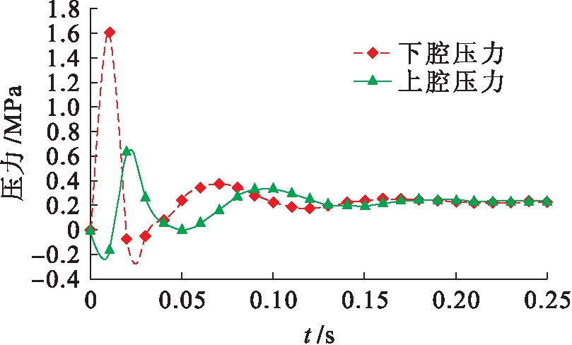 在AMESim模型中施加式(4)所示的载荷,得到液压缸上、下腔压力,当输入载荷(加速度峰值)A1为40g,A2为18.824g时,液压缸上、下腔压力如图5所示.液压缸上、下腔压力差与活塞有效面积的乘积即为液压阻尼器的阻尼力值[15],即