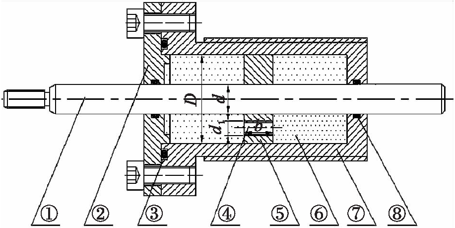 ①活塞杆 ②端盖 ③O型密封圈 ④节流孔 ⑤活塞 ⑥阻尼介质 ⑦缸体 ⑧型密封圈