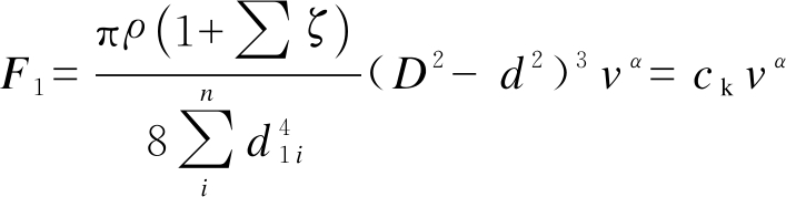 式中:∑ζ为总阻力损失系数(选为0.49),且∑ζ=ζc+ζe,ζc为入口收缩损失系数(选为0.15),ζe为流速扩大损失系数(选为0.34);ck为孔隙系数;α为孔缩衰减系数(0.1≤α≤2),且α=0.103+(e/5)-0.175.