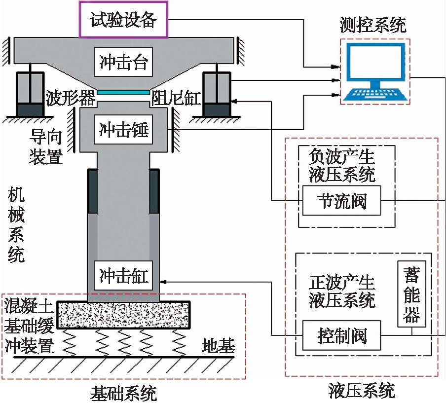 为了验证基于AMEsim仿真结果修定的隔振系统数学模型的正确性,设计隔振系统的试验装置如图8所示.该试验装置由底座、隔离部分、被隔离设备和液压阻尼器四部分构成,液压阻尼器的缸筒通过法兰盘与隔振系统的底座刚性连接,由液压阻尼器中带冲击头的活塞杆支撑被隔离设备.图9为垂向双波冲击台原理简图.采用500 kg垂向双波冲击试验机进行冲击试验,该试验机主要由基础系统、液压系统、机械系统和测控系统等几部分组成[16],其主要工作原理为:冲击前由蓄能器存储冲击所需能量,冲击时蓄能器中的能量在正波液压系统控制下释放,驱动冲击锤撞击冲击台产生正波冲击;当冲击台向上运动达到最大速度时,阻尼缸在负波液压系统控制下对冲击台实施制动产生负波冲击,使冲击台减速运动直到停止.