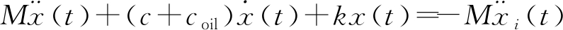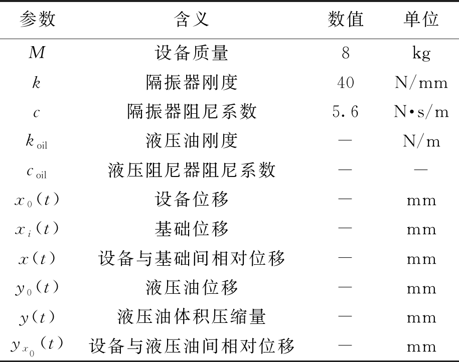 参数含义数值单位M设备质量8kgk隔振器刚度40N/mmc隔振器阻尼系数5.6N·s/mkoil液压油刚度-N/mcoil液压阻尼器阻尼系数--x0(t)设备位移-mmxi(t)基础位移-mmx(t)设备与基础间相对位移-mmy0(t)液压油位移-mmy(t)液压油体积压缩量-mmyx0(t)设备与液压油间相对位移-mm