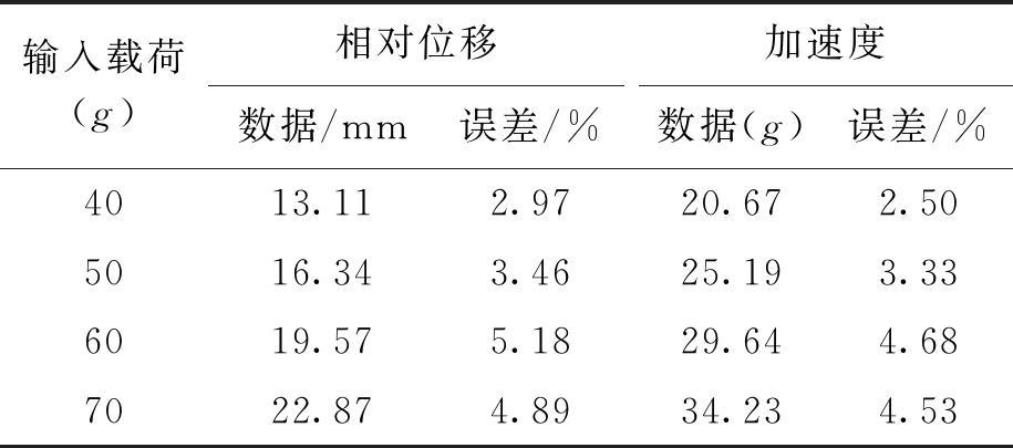 输入载荷(g)相对位移数据/mm误差/%加速度数据(g)误差/%4013.112.9720.672.505016.343.4625.193.336019.575.1829.644.687022.874.8934.234.53