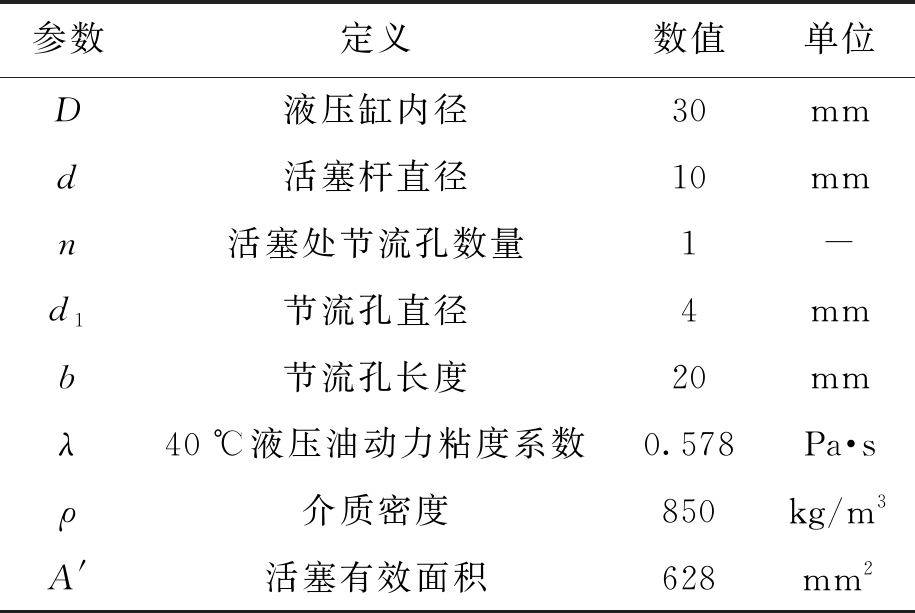 参数定义数值单位D液压缸内径30mmd活塞杆直径10mmn活塞处节流孔数量1-d1节流孔直径4mmb节流孔长度20mmλ40℃液压油动力粘度系数0.578Pa·sρ介质密度850kg/m3A'活塞有效面积628mm2