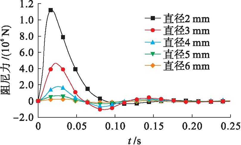 为了探究阻尼器结构参数对系统性能的影响,对阻尼孔尺寸与阻尼力的关系进行了仿真分析,将AMESim模型中阻尼孔的直径分别设定为2、3、4、5和6 mm,施加同样载荷得到图7所示的阻尼力.