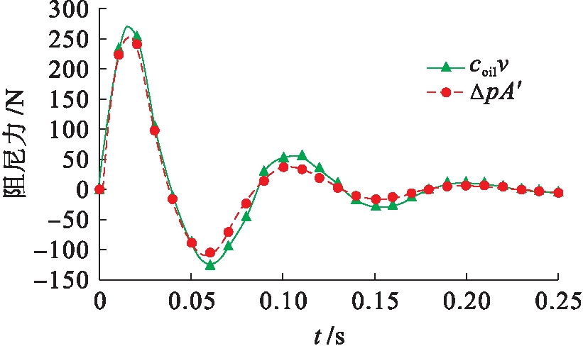由式(9)求出流动指数,得到其平均值为0.838 6,将其代入式(8)中进行计算.将通过AMESim仿真得到的液压阻尼器阻尼力ΔpA′与由式(8)计算得到的阻尼力coilv进行比较,结果如图6所示.由图6可见,阻尼力ΔpA′与coilv趋势非常接近,最大峰值误差为4.6%.