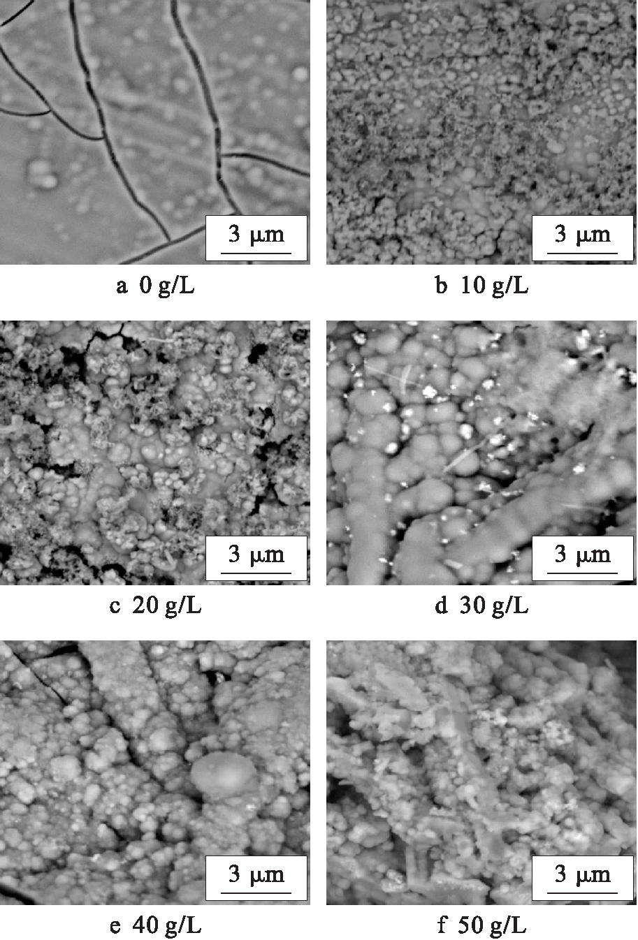 图2为镀液中加入0~50 g/L纳米Cr颗粒后得到的复合镀层表面形貌.由图2a可见,Ni-Mo合金镀层呈现球状晶胞形态,镀层表面应力较大,且具有明显裂纹.与Ni-Mo合金表面相比,Ni-Mo-Cr纳米复合镀层表面明显细化,镀层表面裂纹减少.当Cr含量为10~30 g/L时,镀层表面由球形晶胞团簇而成,镀层较为平整、致密,裂纹消失,镀层表面颗粒得到细化.当Cr含量继续增加到40~50 g/L时,Ni晶粒由球状晶胞转变为枝晶后层叠在镀层表面并呈现团聚状态,镀层表面质量变差且缺陷增多.当纳米Cr颗粒含量为10~30 g/L时,镀层表面颗粒分布较为均匀,其中当纳米Cr颗粒含量为20 g/L时,镀层表面形貌最佳.