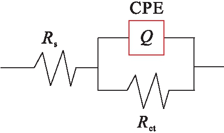 图4为不同纳米Cr颗粒含量下复合镀层在1 mol/L NaOH溶液中的交流阻抗谱图.由图4可见,不同镀层的阻抗弧均为单一容抗弧,且在高频区受电化学极化控制.图5为不同纳米Cr颗粒含量下复合镀层在1 mol/L NaOH溶液中的交流阻抗等效电路图,其相应的拟合数据如表3所示.其中:Rs为溶液电阻;CPE为常相位元件并用以代替双电层电容Q;Rct为电化学反应的电荷传递阻抗;Ar为镀层的真实表面积,且Ar=Q/Cd;Cd为参比电极双电容,其数值为20 μF[11].由图4可见,Ni-Mo-20Cr纳米复合镀层的阻抗半径最小,且阻抗半径越小,析氢性能越好.由表3可见,Ni-Mo-20Cr纳米复合镀层的真实表面积最大,且约为Ni-Mo镀层的8倍,说明适量纳米Cr颗粒的加入能够增大镀层的真实表面积,提高镀层的析氢能力.