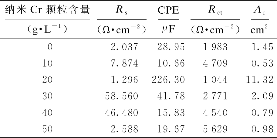 纳米Cr颗粒含量(g·L-1)Rs(Ω·cm-2)CPEμFRct(Ω·cm-2)Arcm202.03728.9519831.45107.87410.6647090.53201.296226.30104411.323058.56041.7827712.094046.48015.8345400.79502.58819.6756290.98