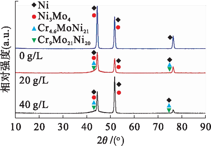 图1为镀液中分别添加不同含量纳米Cr颗粒后镀层的XRD谱图.由图1可见,Ni-Mo合金镀层中Ni分别在2θ为44.6°、51.96°和76.56°附近出现强峰,分别对应Ni的(111)、(200)和(220)晶面.而在Ni-Mo-Cr镀层中,同样存在3个衍射峰,但是对比Ni-Mo合金镀层可以发现,在Ni-Mo-Cr复合镀层中的所有衍射峰强度均较Ni-Mo合金镀层有所减弱但衍射峰宽度变大,说明纳米Cr颗粒的加入并未改变Ni-Mo合金镀层的晶体结构,但是改变了Ni-Mo合金的生长状态.Ni-Mo合金镀层吸附纳米Cr颗粒后,阻碍了Ni-Mo合金晶粒的生长,使得原有的择优取向生长消失.在图1中未发现单独的Cr峰,这是由于Cr被还原的Ni所覆盖.当纳米Cr颗粒含量分别为0、20和40 g/L时,根据Scherrer公式计算得到3种镀层中Ni的晶粒尺寸分别为19.5、18.9和19.1 nm,说明纳米Cr颗粒的加入,细化了Ni-Mo合金镀层的晶粒尺寸,且当纳米Cr颗粒含量为20 g/L时,Ni晶粒尺寸最小.