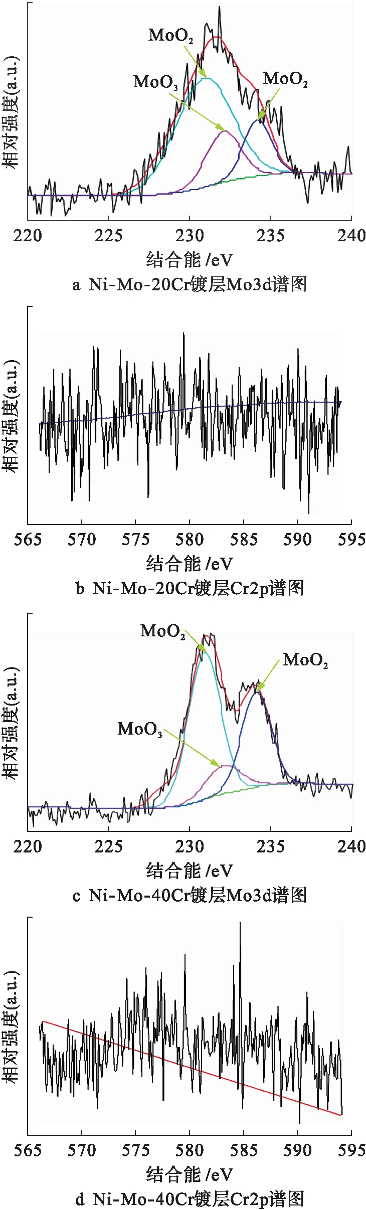 图7为Ni-Mo-Cr纳米复合镀层的XPS全谱扫描测试结果,结合能范围为0~1 400 eV.由图7可见,Ni-Mo-20Cr纳米复合镀层的谱图所激发出的能量较小,说明该镀层能快速形成钝化膜,而Ni-Mo-40Cr纳米复合镀层形成钝化膜时要慢一些.