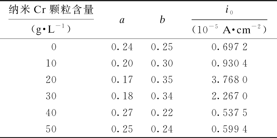 纳米Cr颗粒含量(g·L-1)abi0(10-5A·cm-2)00.240.250.6972100.200.300.9304200.170.353.7680300.180.342.2670400.270.220.5375500.250.240.5994