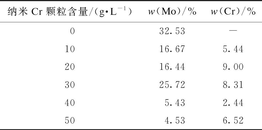 纳米Cr颗粒含量/(g·L-1)w(Mo)/%w(Cr)/%032.53-1016.675.442016.449.003025.728.31405.432.44504.536.52