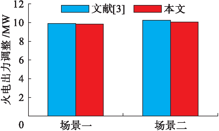 1) 静态仿真.算例中的静态仿真不考虑智能体控制耗时和传统基于控制响应函数计算耗时,本文方法和文献[3]调控策略差异对比如图5所示.场景一中风电增加出力10 MW,为防止断面越限,传统方法控制策略共减少火电出力9.85 MW,而本文所提出方法减少火电出力9.8 MW;场景二中风电减少出力10 MW,传统方法控制策略共增加火电出力10.2 MW,而本文所提出方法增加火电出力10.0 MW.两个场景下,两种方法的控制策略偏差不超过2%,表明在静态控制中,两种方法具有相近的控制效果.