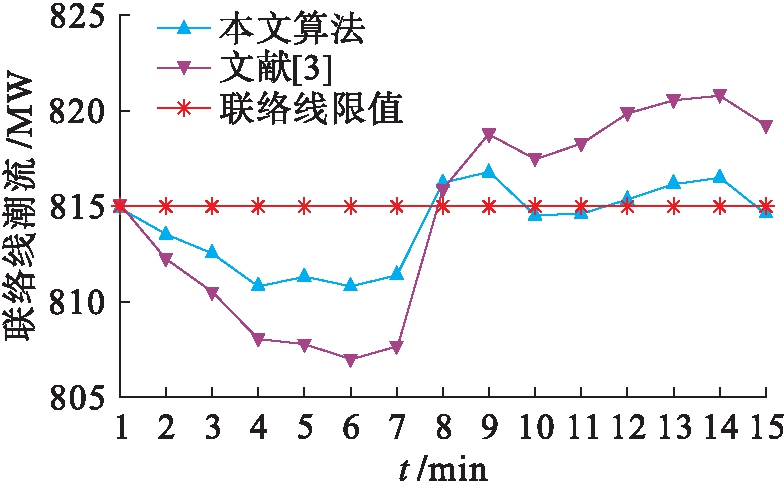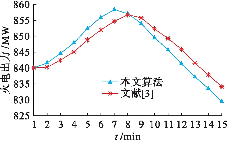 2) 动态仿真.本文所设计的风电出力变化曲线如图6所示,两种控制方法的火电调节控制变化和联络线交换功率变化分别如图7、8所示.在相同的风电出力变化动态过程中,传统方法由于计算控制响应函数耗时较长,导致火电机组出力变化滞后于本文所提出的方法,进而导致联络线交换功率变化的响应速度也相应滞后.该联络线交换功率控制值为815 MW,本文所提出方法的断面功率越限时间仅为5 min,而传统方法则超过8 min,表明本文所提出的方法具有更高的控制效果,对消除区域电网断面越限等具有显著效果.
