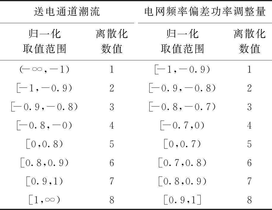 在得到上述归一化环境状态量后,还需要进一步对其进行离散化处理.考虑到送电通道潮流和电网频率偏差功率调整量存在的方向性要求,文中对多环境状态进行离散化处理,结果如表1所示.
