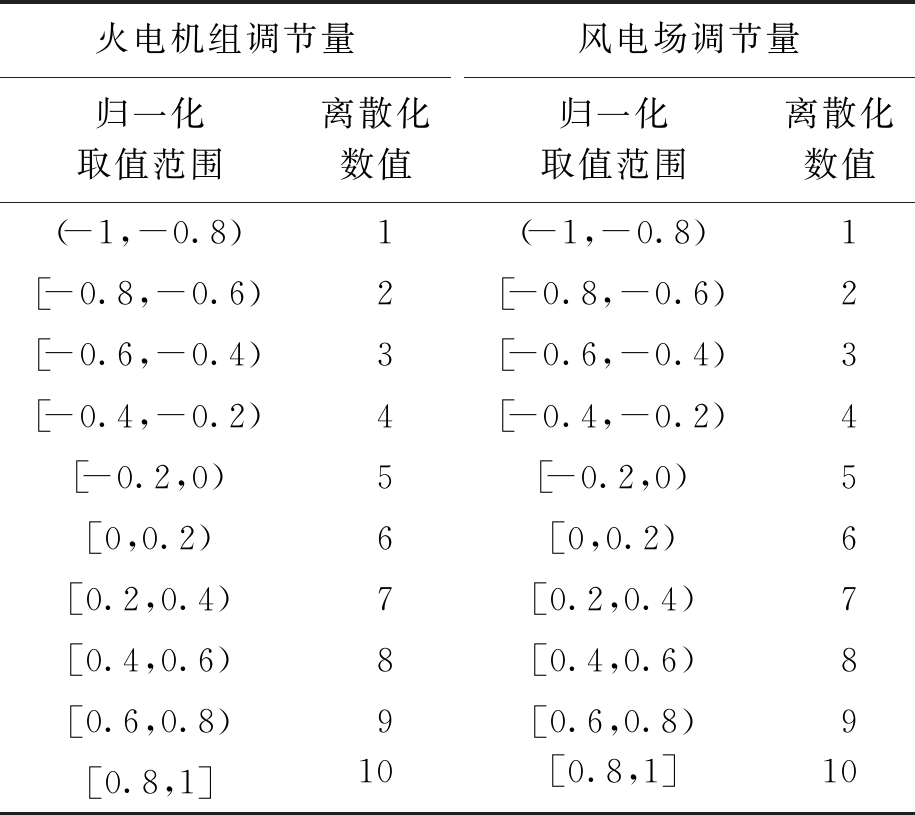 依次为风电场调节量离散化数值;C、W分别为区域电网中火电机组数和风电场数.类似环境状态的处理方式,可根据最大调整量对动作空间进行归一化处理,结果如表2所示.