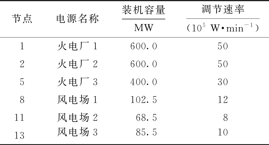 节点电源名称装机容量MW调节速率(105W·min-1)1火电厂1600.0502火电厂2600.0505火电厂3400.0308风电场1102.51211风电场268.5813风电场385.510