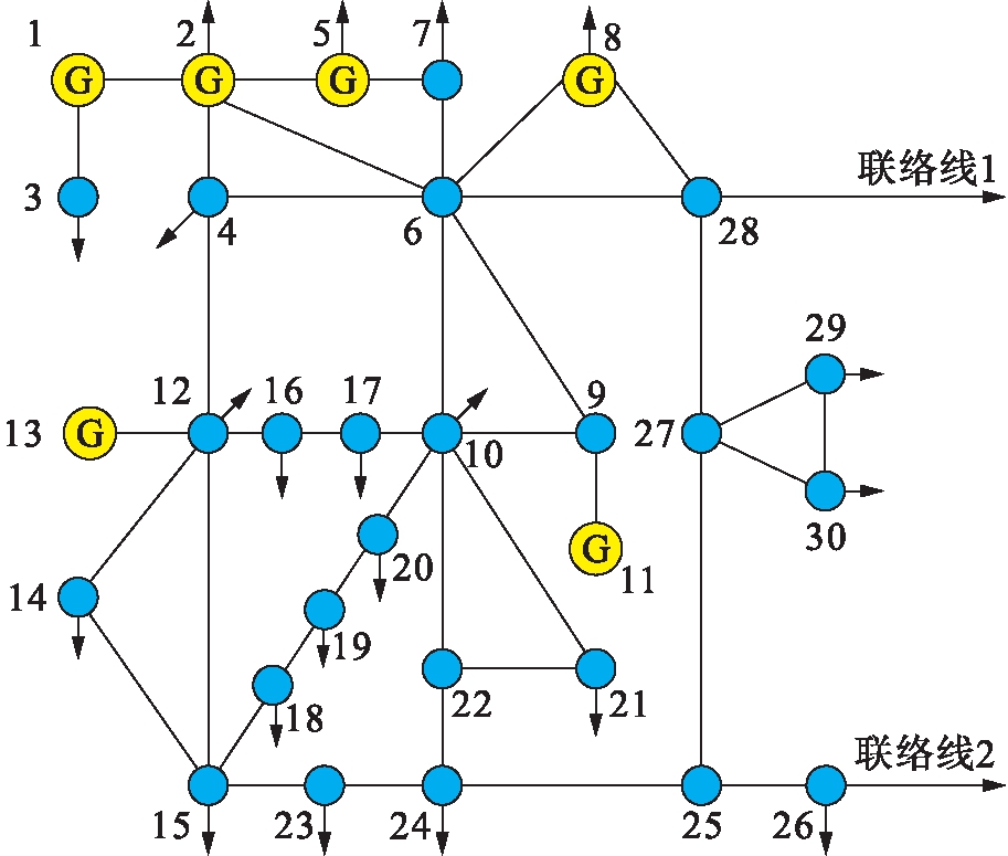 本算例中将对IEEE-30节点系统进行改造,在原节点26与节点28处分别增加一条对外联络线,以模拟区域电网与主网相连的场景,验证本文所提算法的有效性.改造后所得的地区电网网架结构如图4所示.